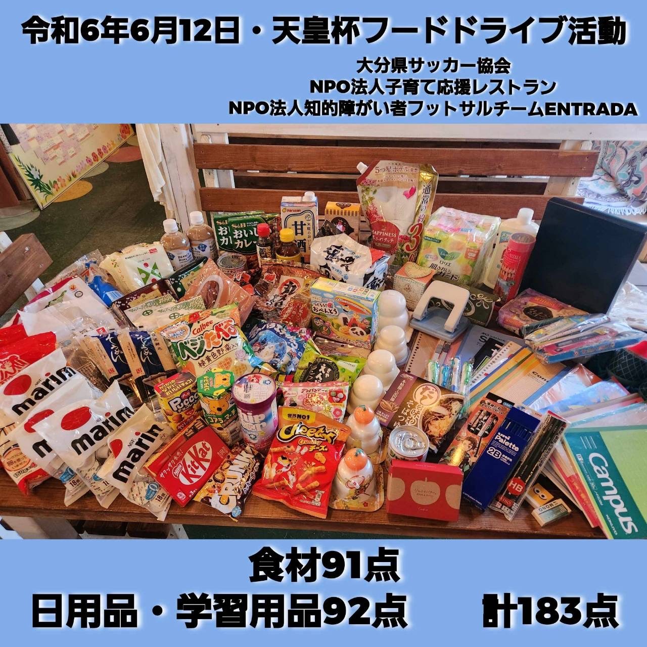 6月12日天皇杯2回戦の会場にて開催致しましたフードドライブについて多くの皆様のご好意をお預かり致しました