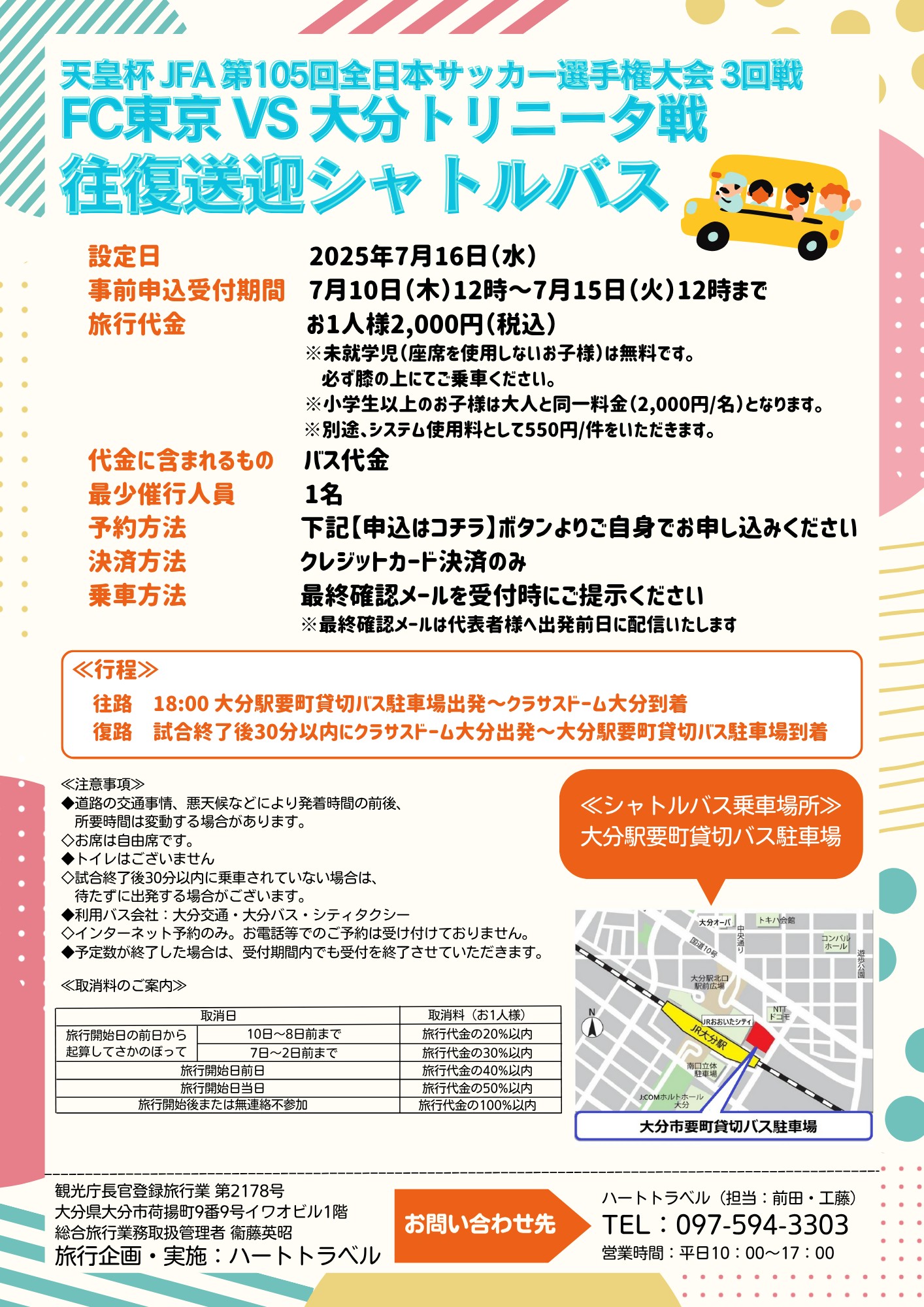 試合終了後30分以内にクラサスドーム大分出発~大分駅要町貸切バス駐車場到着