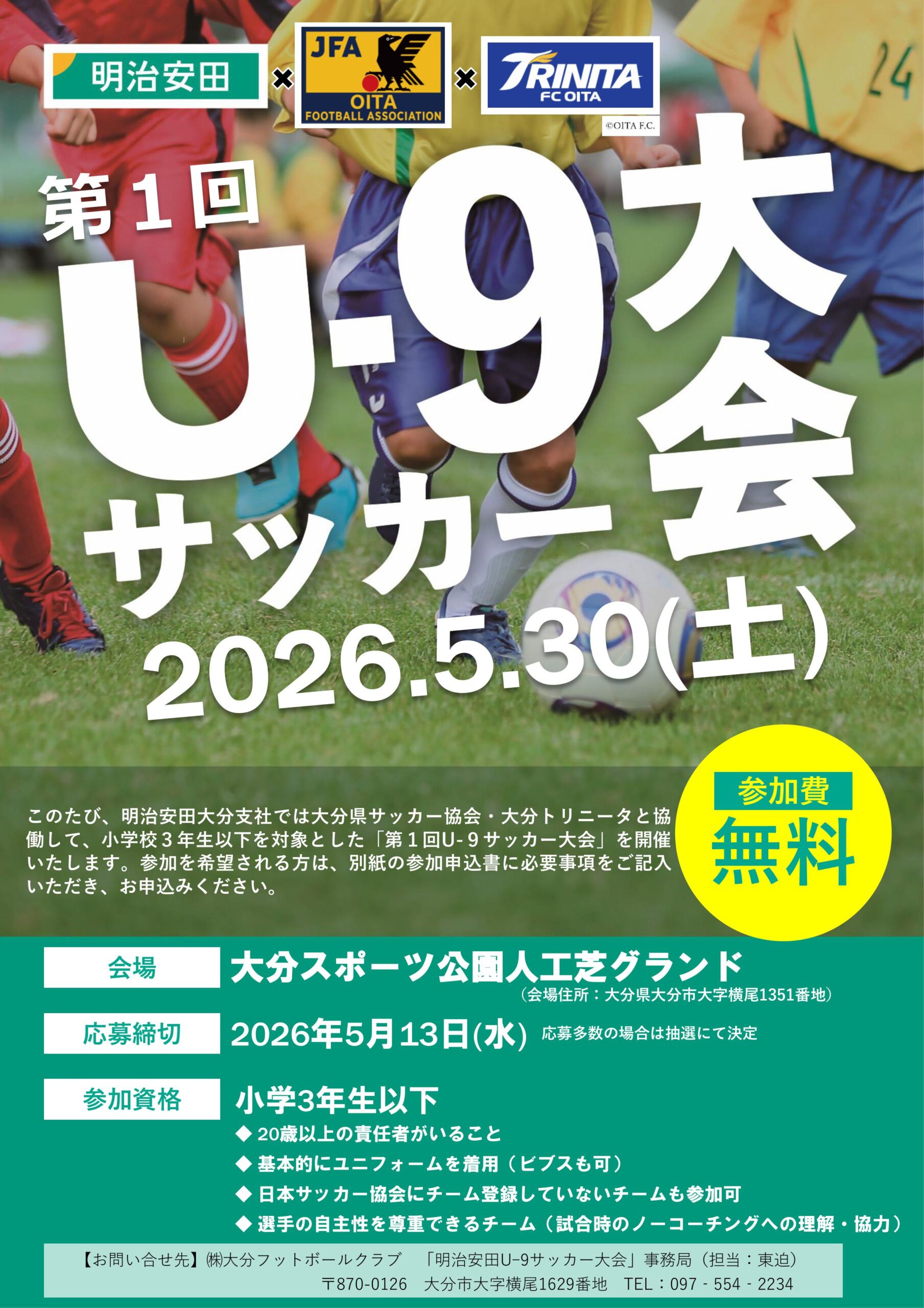 明治安田大分支社、大分トリニータ、大分県サッカー協会との協働により小学校3年生以下を対象とした『第1回 U-9サッカー大会』を2026年5月30日(土)に開催します