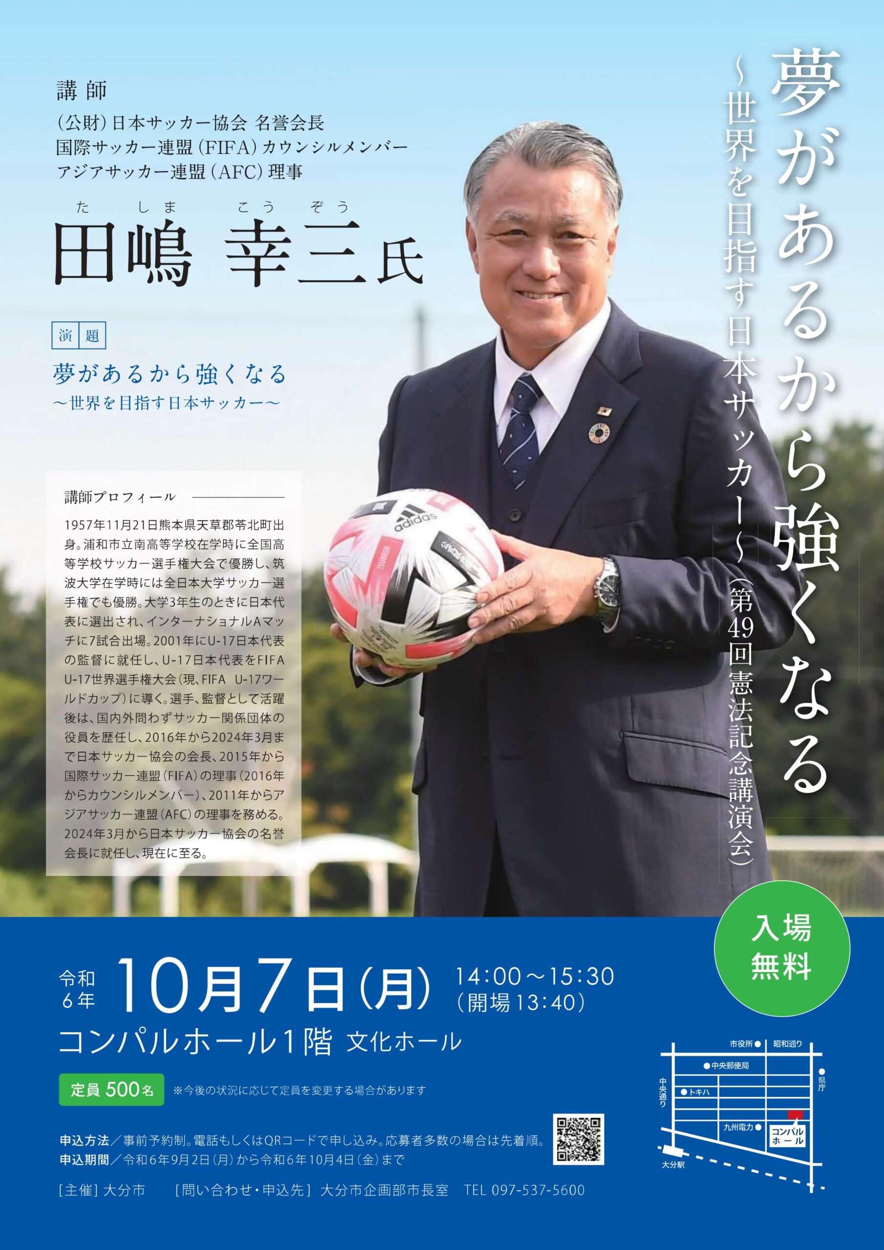 大分市主催の『第49回憲法記念講演会』にJFA名誉会長の田嶋幸三氏が講話を行います
